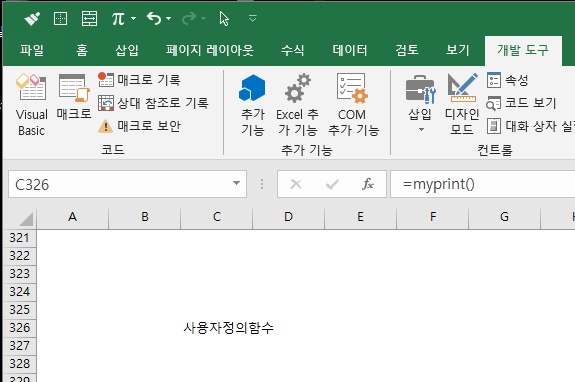 해당 시트에 =myprint( )을 입력해보시면 아래와 같이 아까 VBA로 구현한 내용이 정상 출력 되는것을 확인 하실 수 있습니다.
