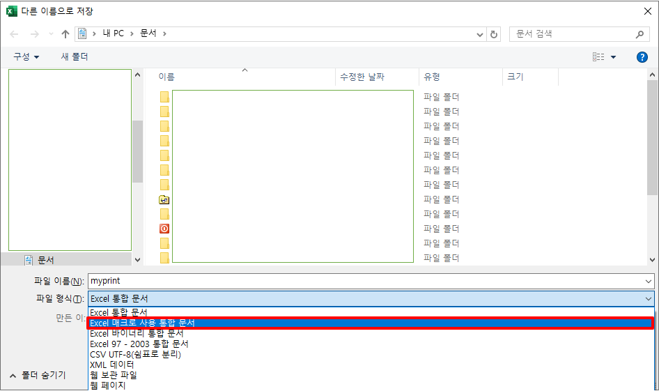 이후 통한 문서를 저장하고, 저장옵션을 'Excel 매크로 사용 통합 문서'로 저장 하시면 끝납니다.